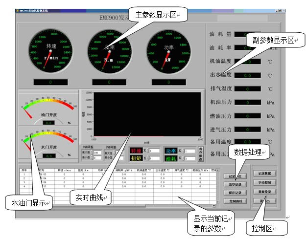 1、測試參數(shù):轉(zhuǎn)速、扭矩、功率、排氣溫度、機油溫度、機油壓力、出水溫度、油耗率